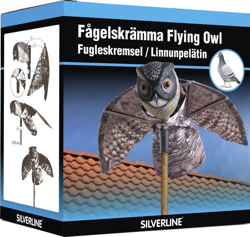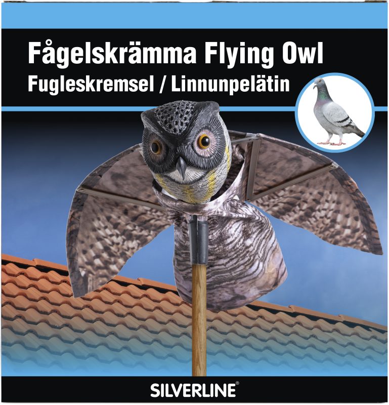 Flyvende Ugle er en naturlig og miljøvennlig fugleskremmer som effektivt holder duer, måker, kråker og andre fugler unna bygninger, uteområder og båter. Uglens store, reflekterende øyne og vinger som beveger seg i vinden skaper en realistisk rovfugleffekt som fugler oppfatter som en trussel – og dermed holder seg unna.