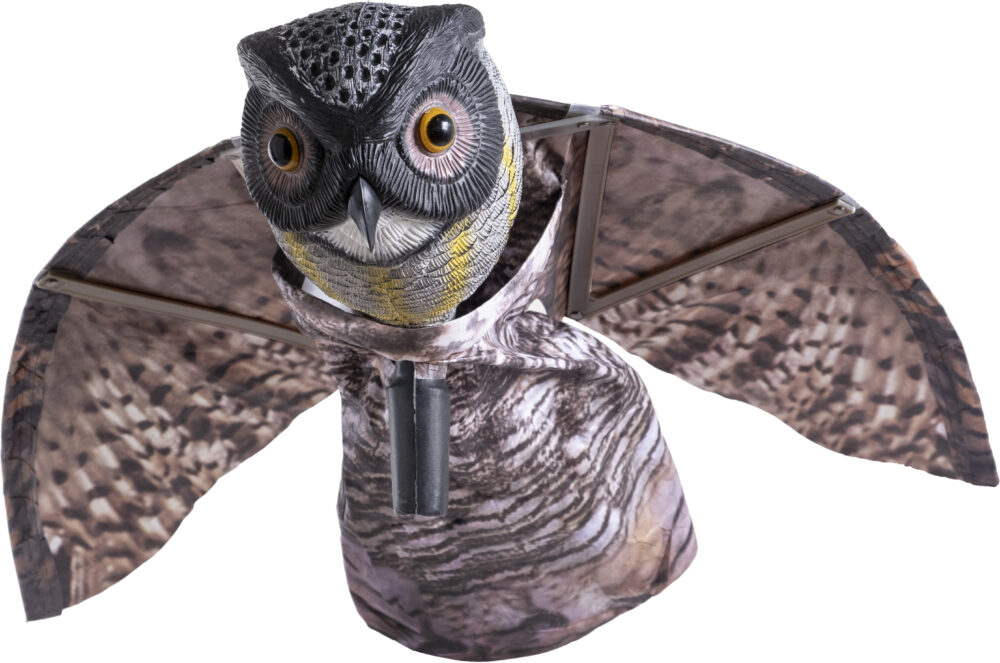 Skrem bort plagsomme fugler – naturlig og effektivt! Flyvende Ugle holder måker, kråker, duer og andre fugler unna. Med store øyne og vinger som beveger seg i vinden, gir den en realistisk og skremmende effekt – helt uten lyd, lukt eller gift.