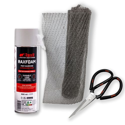 Komplett tetningspakke mot mus og rotter – RaxFoam + Mesh 10 m + Spesialsaks er en effektiv alt-i-ett-løsning for varig sikring mot gnagere.