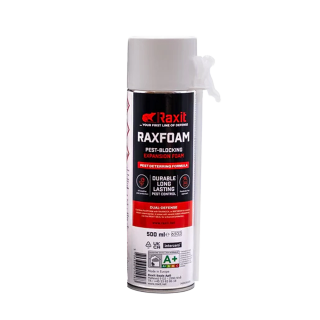 RaxFoam er et spesialutviklet tetningsskum som inneholder tilsetninger som gjør skummet lite attraktivt for mus og rotter. Samtidig ekspanderer skummet kraftig og fyller effektivt hulrom, sprekker og åpninger i konstruksjonen.