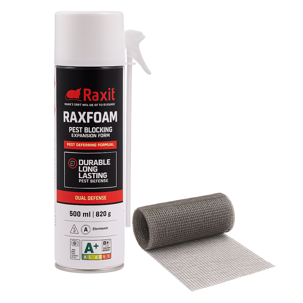 RaxFoam Tetningsskum + Mesh sikringsnett 5 meter – 50 mm bredde er den ideelle totalløsningen når du vil stenge ute mus, rotter og andre skadedyr på en trygg, effektiv og varig måte. Kombinasjonen av et ekspanderende, gnageravskrekkende tetningsskum og et Mesh sikringsnett gir en fysisk og kjemisk barriere som skadedyr ikke kommer seg gjennom. Denne pakken passer like godt for profesjonelle skadedyrbekjempere som for huseiere som ønsker en solid og holdbar tetting.