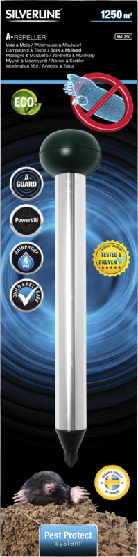 Med teknologien bak Silverline A-Guard lages kraftfulle PowerVib™-vibrasjoner i bakken som forstyrrer sorkers og muldvarps naturlige atferd og får dem til å forlate området. Det solide aluminiumrøret skrus enkelt ned i bakken og gir umiddelbar effekt. I kompakt leirjord dekker enheten opptil 1250 m², og den drives med batterier (ikke inkludert).