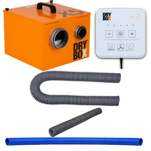 Med DryBox X5 Kjellerkit får du en kraftig luftavfukter som gir effektiv avfukting i store rom og kjeller med alt du trenger for å komme i gang. Med i startpakken følger tørrluftsslanger, våtluftsslange og display med 15 meters kabel.