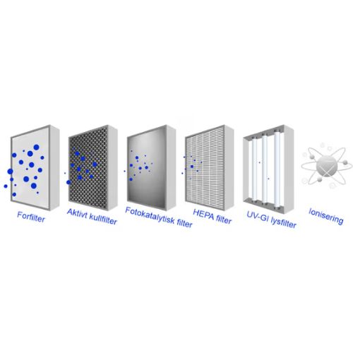 | Filterteknologi | 6-trinns filtrering (forfilter, kullfilter, kald katalysator, HEPA, UV-GI, ionisator) |