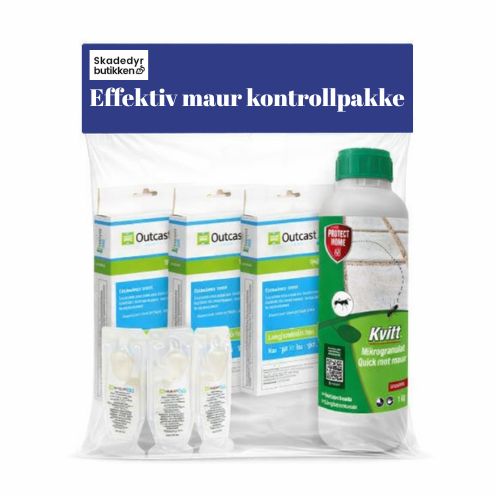 Effektiv maur kontrollpakke er satt sammen for deg som vil bekjempe maur grundig – både inne og utendørs. Pakken inneholder 9 Advion Ant Outcast mauråtestasjoner med totalt 36 gram mauråte, kjent som en av verdens mest effektive mauråter på det private markedet og fungerer mot de fleste maurarter, også stokkmaur. Maurene tar åten med tilbake til tua slik at hele kolonien bekjempes. I tillegg følger Kvitt mot maur strø- og utvanningsmiddel (1 kg) med i pakken, slik at du også kan gjennomføre en effektiv utvendig behandling rundt boligen for et mer varig og profesjonelt resultat.