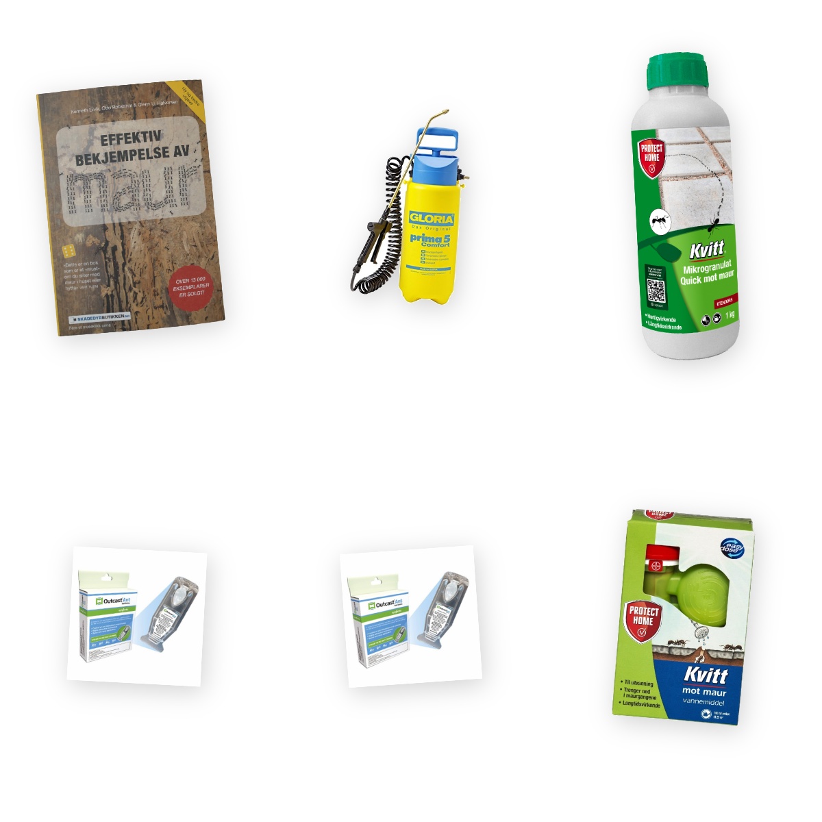 Maurfritt Hjem Kit - Stor pakke er satt sammen for deg som vil gjøre jobben skikkelig: forebygge, bekjempe og følge en plan som faktisk fungerer. Du får både midler til uteområder, åtestasjoner for kolonibekjempelse, riktig utstyr og tilgang til en praktisk E-bok som viser hvordan du lykkes trinn for trinn (tilgang ved å scanne QR kode).
